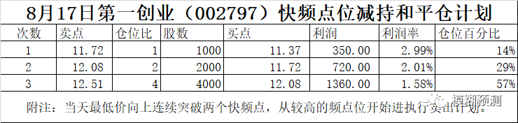 这两支票如果直接这么出局应当是行情没赚完,至少按给出的快频点位每天高抛低吸进行量化交易,再操作一个星期,差不多就涨到位了,再出局不迟,此时在盈利单的操作,心态应当是很好的。大家是否还记得在上周四我说的第一创业(002797)在涨停板,排在东方财富股池前六名,建议大家介入了,按开盘价回撤快频点位8.66时介入,今天这票最高上行到了12.10元。